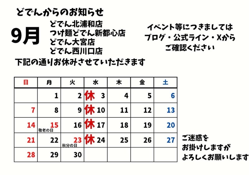 (9/22(月)は平日のため北浦和店は夜営業のみです。)